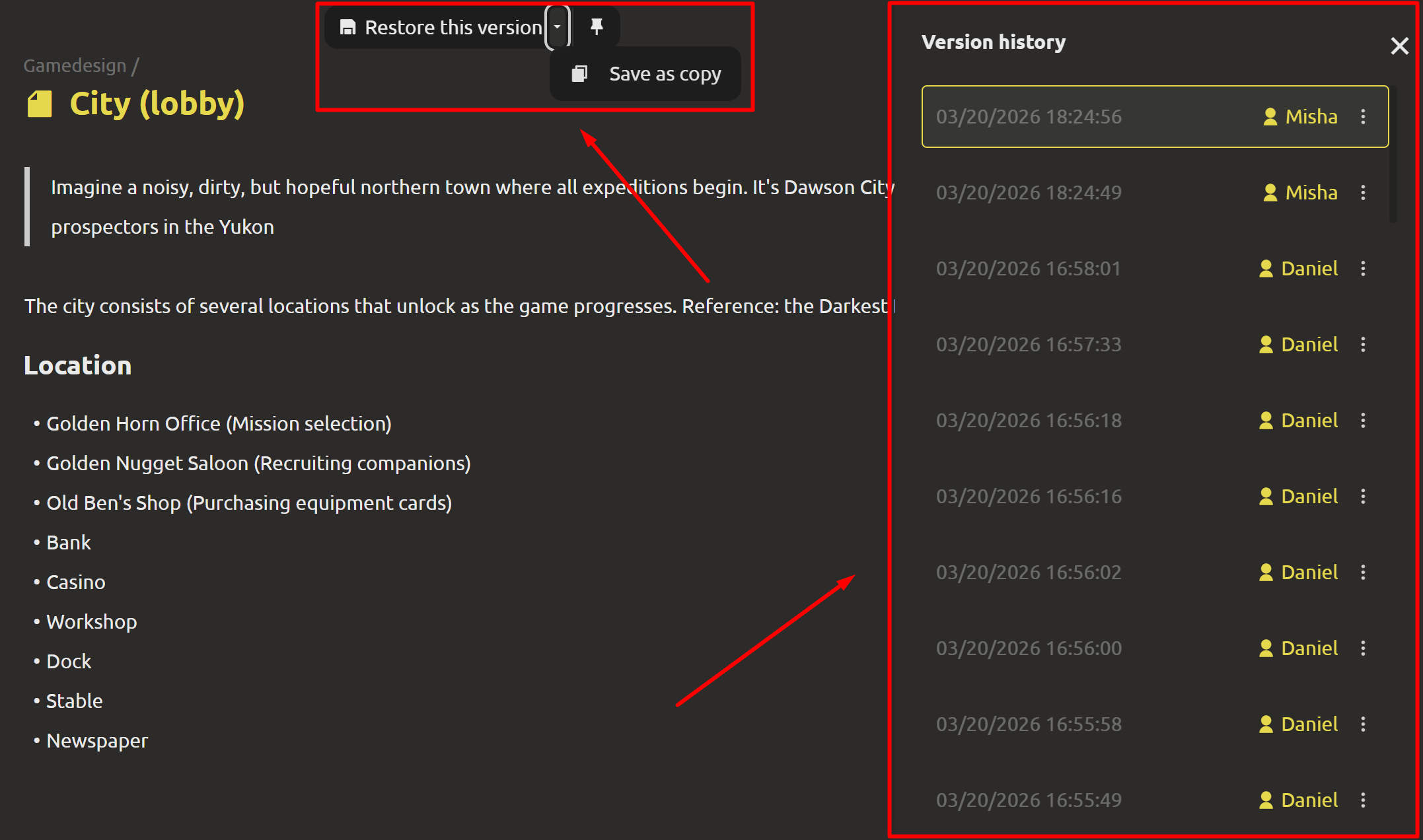 To do this, select "History" from the file menu. A panel with a list of changes will open on the right, displaying the date and author for each entry. To view a previous version, simply click it. If you've found what you need, you can restore the current version or create a copy using the menu on the right or the buttons pinned at the top: "Restore this version" and "Save as copy."