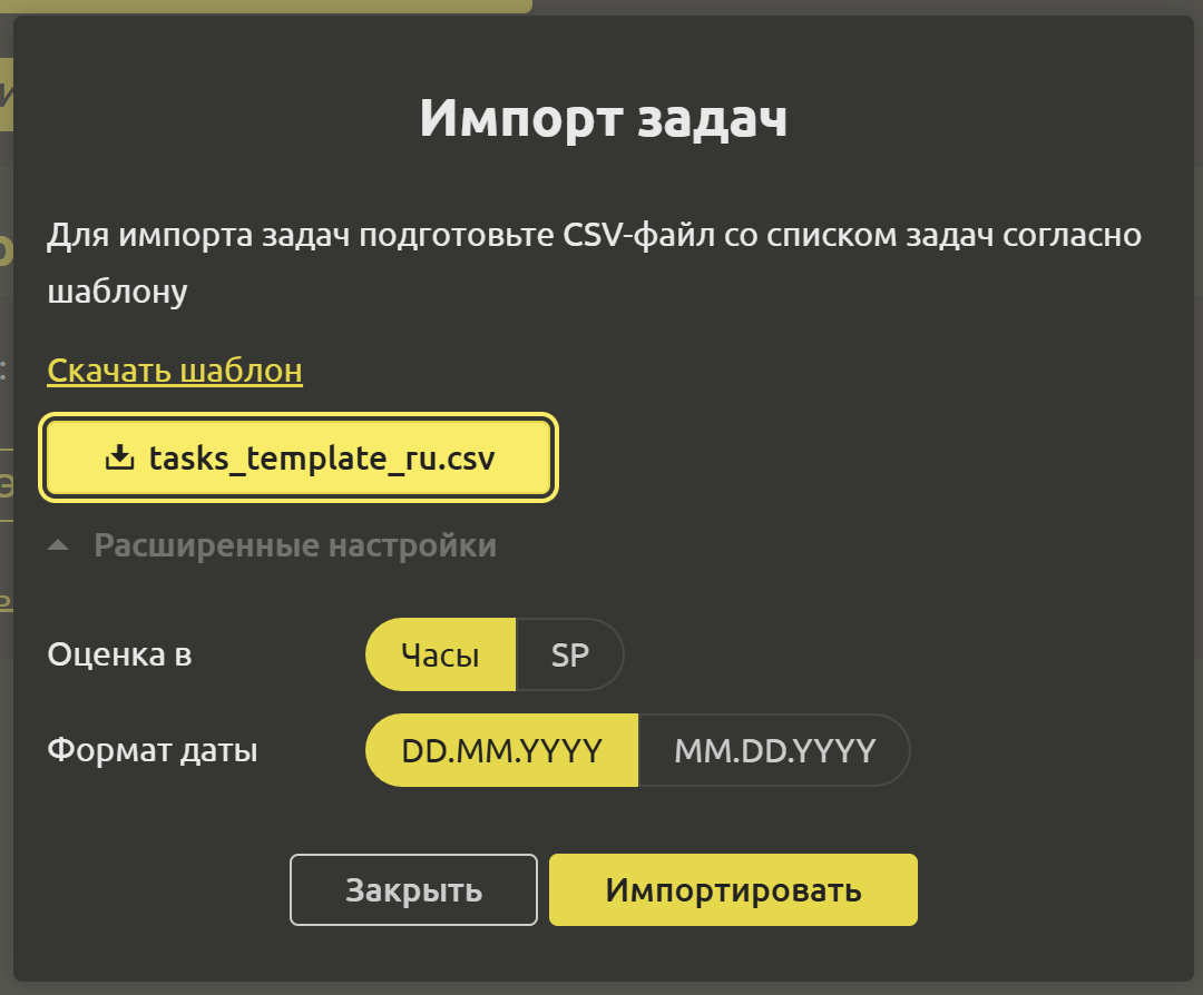 В открывшемся окне «Импорт задач» загрузите подготовленный CSV-файл, предварительно сверившись с нашим шаблоном (его можно скачать в этом же окне).