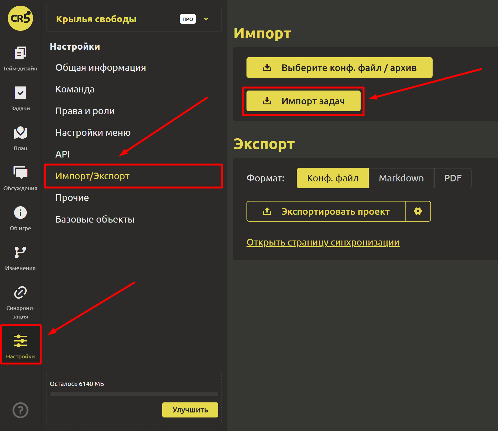 Перейдите в раздел «Настройки» -> «Импорт/Экспорт». В блоке «Импорт» нажмите кнопку «Импорт задач».
